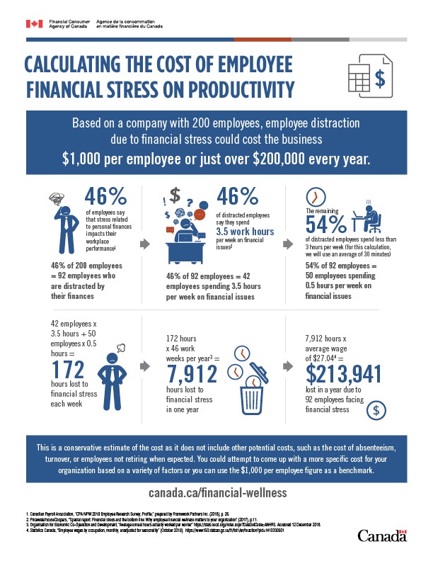 According to one study, financially stressed employees are 5 times more likely to be distracted at work and 46% spend at least three hours a week dealing with financial issues.5  The government of Canada estimates that distractions due to financial stress costs companies about $1000 per employee each year.4  Statistics like these make a solid business case for actively helping employees improve their financial wellbeing.  So how do you create a program that supports your employees’ financial health?